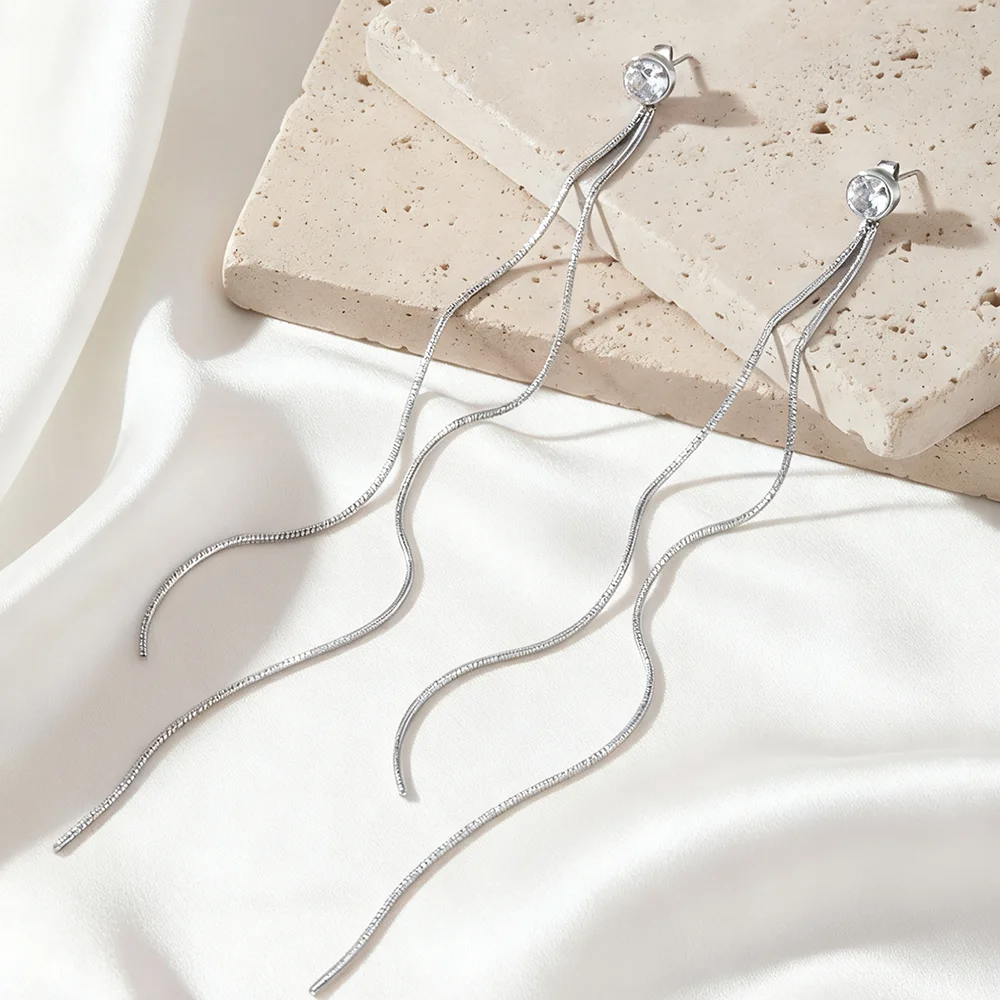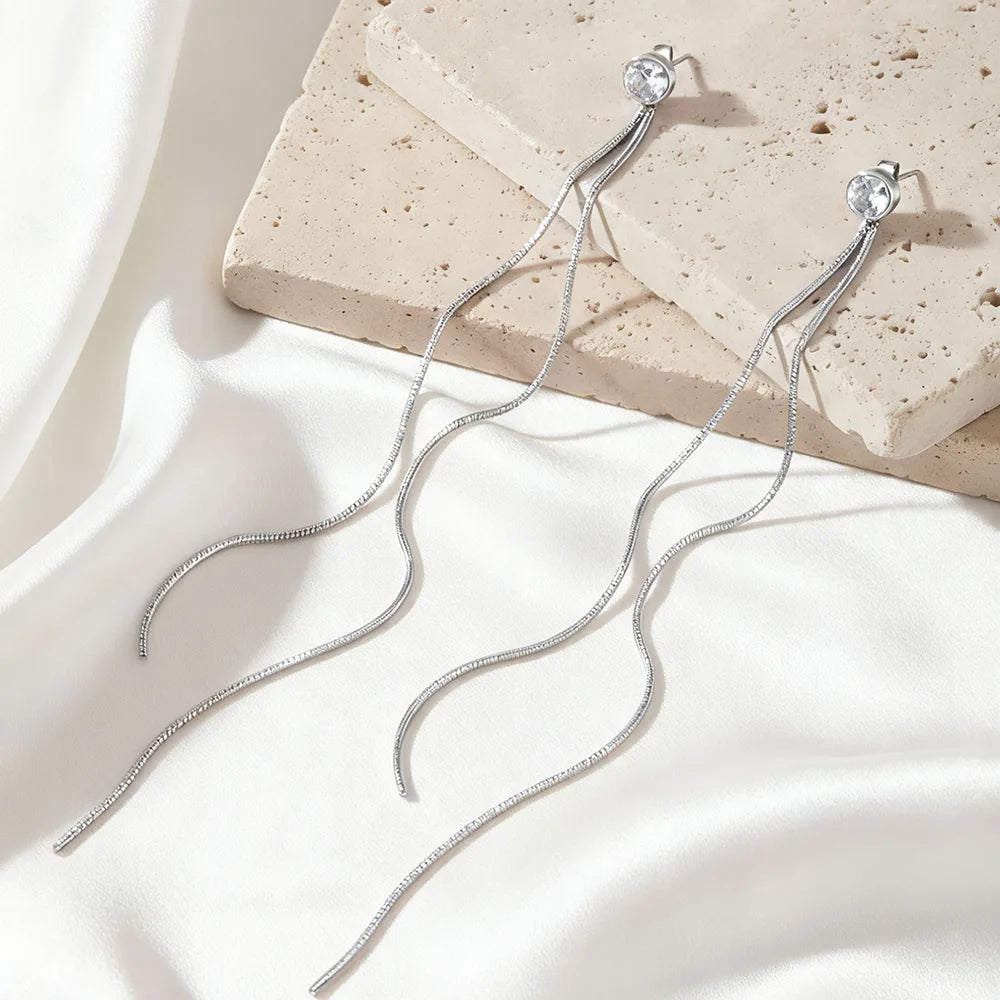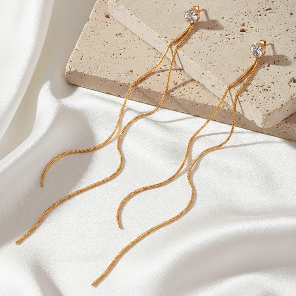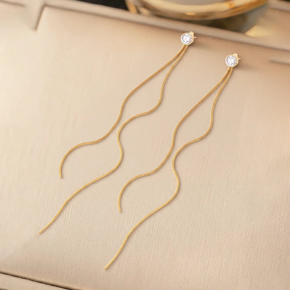 Stainless Steel Fashion Minimalist Zirconia Stud Earrings With Long Tassel Women's Light Luxury Versatile High-End Ear Jewellery