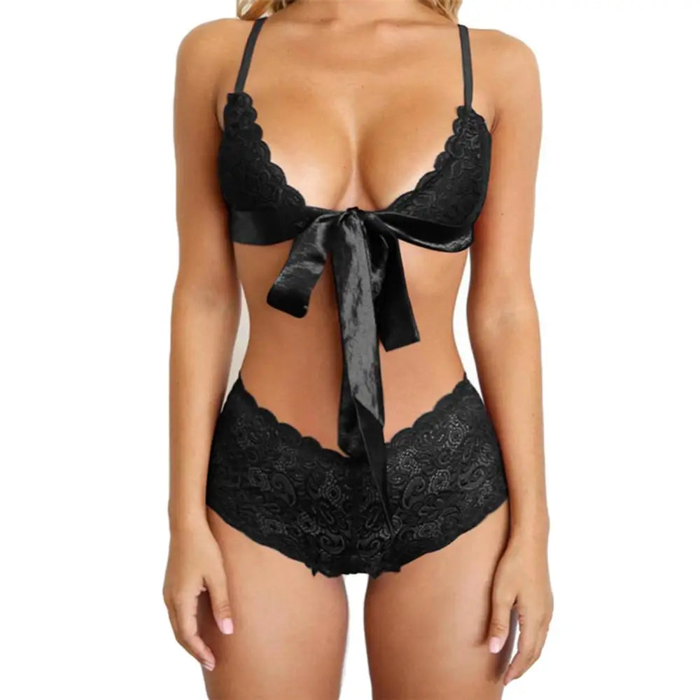 Women Sexy Underwear Set Adjustable Straps Ribbon Bralette Briefs Lace Nightdress Bow Lingerie Pajamas Babydoll Sleepwear Erotic