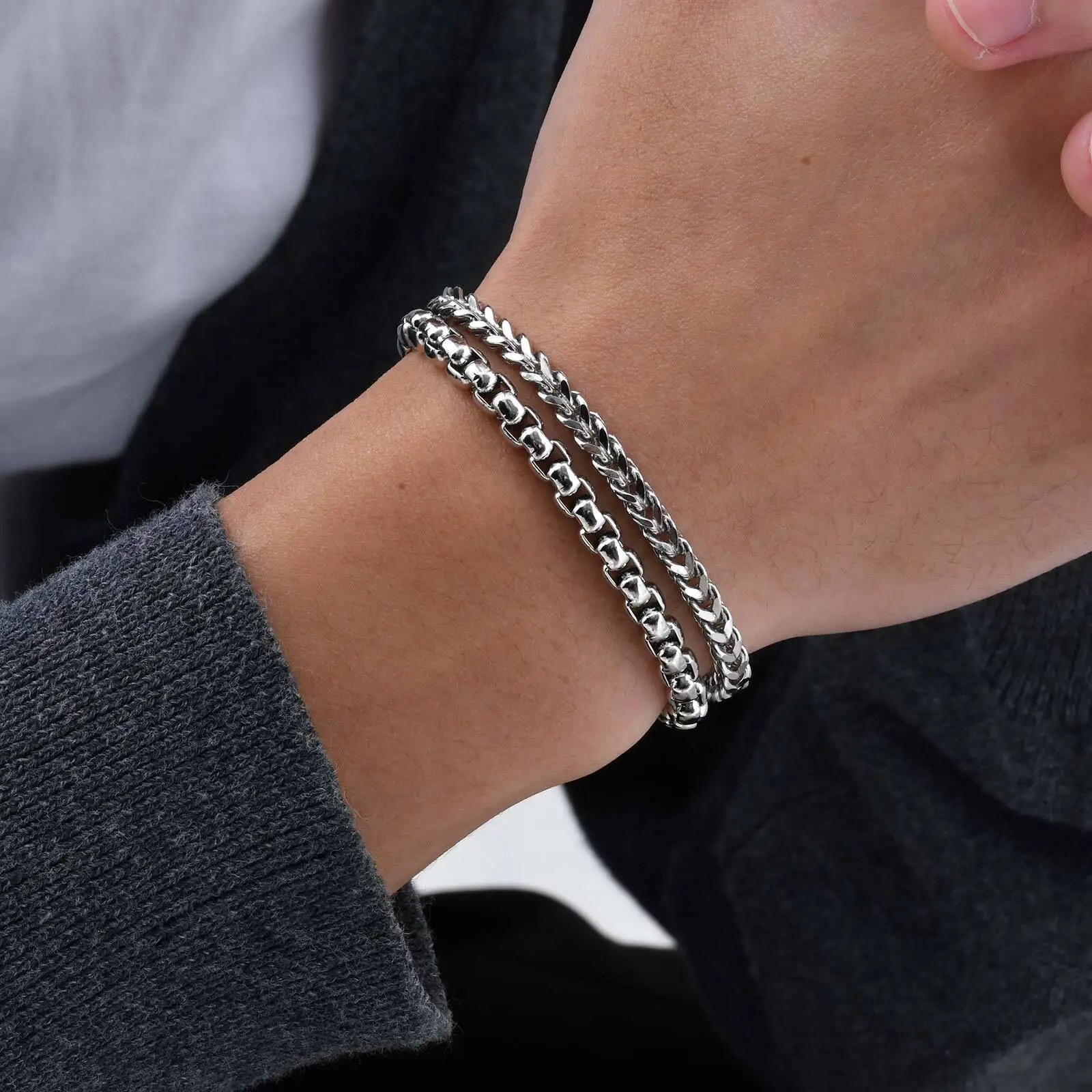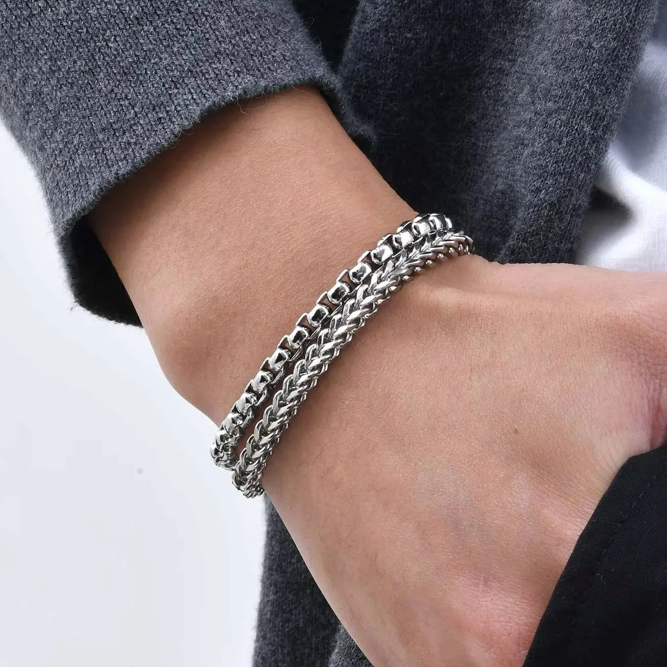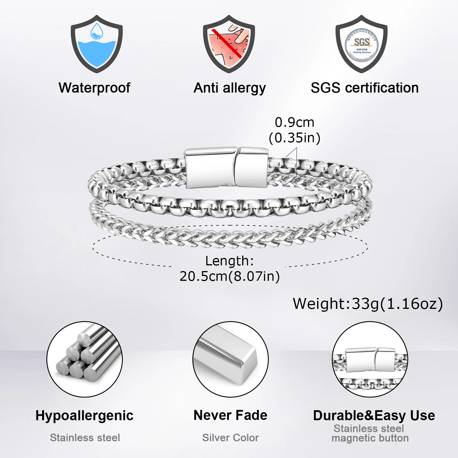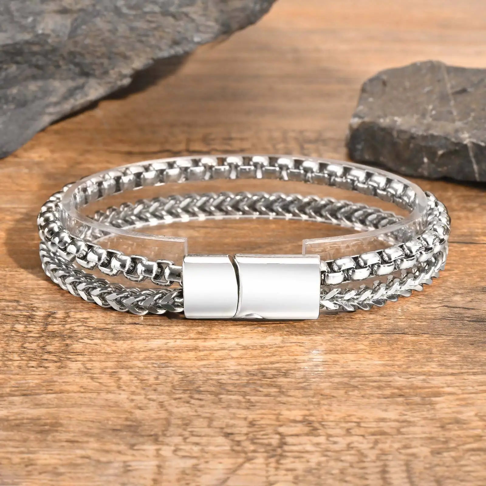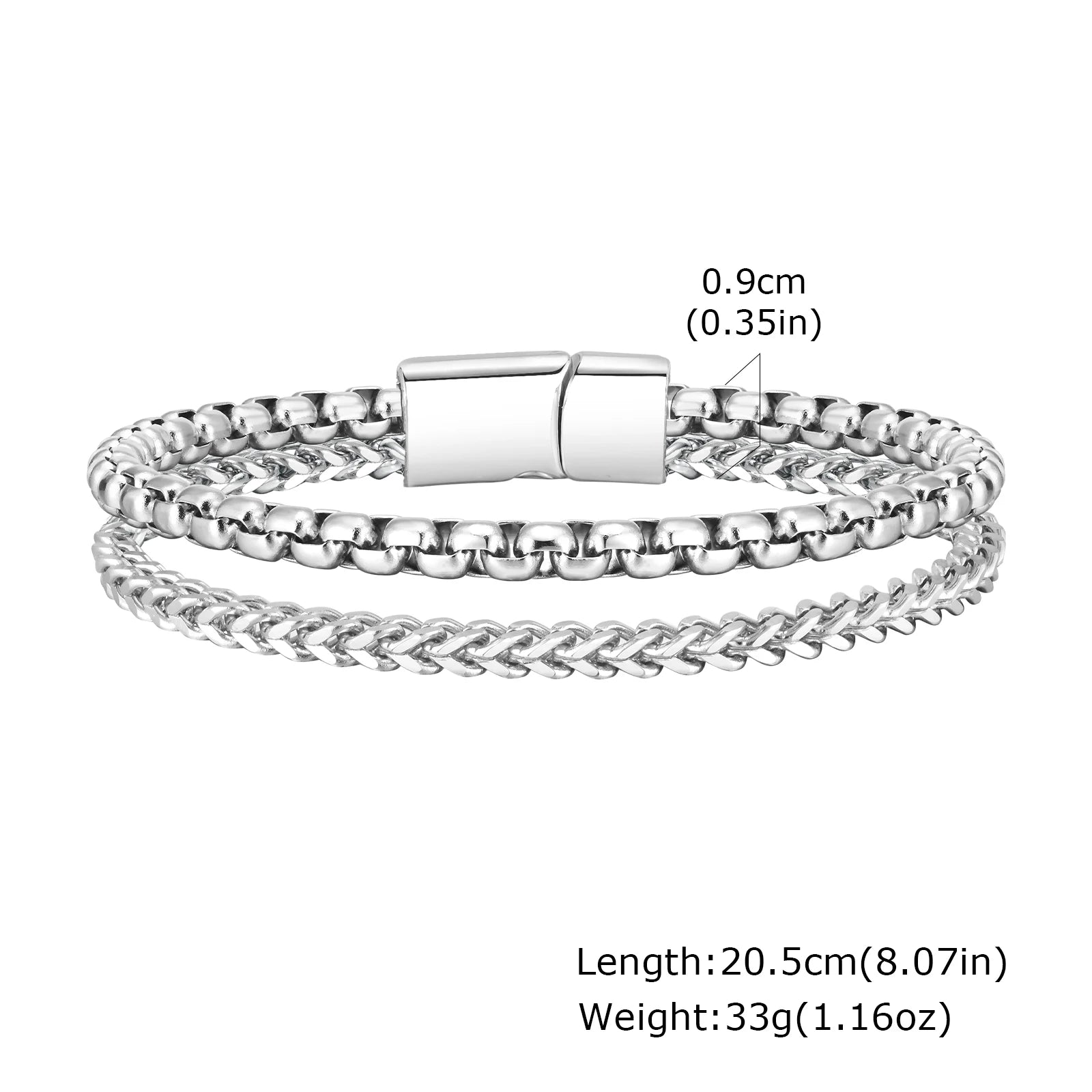Mens Stainless Steel Bracelets,Double Layer Chain Links Wristband with Magnetic Button,Trendy Jewelry Gifts for Dad Boys